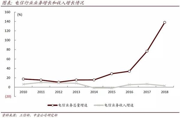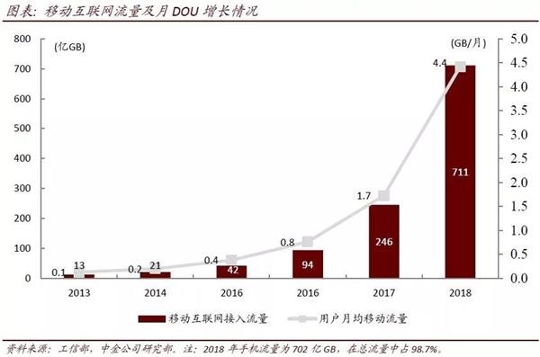 2018年手机上网流量达到702亿GB,同比增长199%,移动数据收入同比增长10.2%(隐含流量价格下降约60%)。数据流量爆发式增长背后是线上线下服的加速融合,移动支付、移动出行、移动直播等应用迅速普及。我们认为流量价格持续下行将会刺激用户流量消费继续保持快速增长,为运营商的长期增长提供引擎,同时也会带来网络规模扩张。