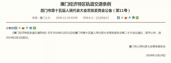 《厦门经济特区轨道交通条例》2月1日起施行。