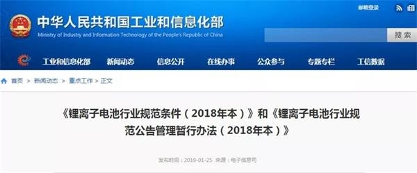 为进一步加强锂离子电池行业管理,推动产业加快转型升级,工业信息部对《锂离子电池行业规范条件》和《锂离子电池行业规范管理暂行办法》进行了修订,形成了《锂离子电池行业规范条件(2018年本)》和《锂离子电池行业规范公告管理暂行办法(2018年本)》。