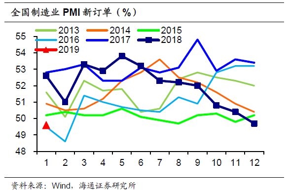 线下微升,通胀仍趋下行 ——海通宏观周报(姜超等) 摘要 海外:1月31日,欧洲统计局公布18年四季度欧元区环比初值0.2%,持平于前值,同比初值1.2%,低于前值的1.6%,为近四年新低。上周四,印度央行以4票赞成、2票反对通过了下调25个基点至6.25%的决议。 经济:PMI线下微升。18年工业企业利润增速较17年显著下滑,主要缘于终端需求放缓拖累工业需求,以及工业品价格涨幅明显回落,其中12月利润增速回落至-1.9%,创16年以来新低。19年1月全国制造业PMI为49.5%,仍在荣枯线下,这固然与19年春节较早有关,但也同样反映制造业景气依然偏弱。主要分项指标中,需求、生产偏弱,库存改善,价格反弹。受春节错位影响,2月上旬地产销量增速走低,而乘用车批发增速跌幅仍大,需求依然偏弱。19年1月上中旬重点钢企粗钢产量增速回落,1月六大集团发电耗煤增速也在低位,指向工业生产低迷。 物价:通胀仍趋下行。节前一周食品价格涨幅趋缓,预计1月食品价格环涨2%,1月CPI稳定在1.9%。1月购进价格指数回升至46.3%,出厂价格指数也升至44.5%,我们预测1月环降0.4%,同比降至0.2%。节前蔬菜价格季节性上涨,但涨幅低于去年同期,1月CPI有望保持稳定,但2月CPI由于春节错位效应或大幅下滑。虽然1月份以来商品价格明显反弹,但环比依旧在下降,而由于去年同期PPI环比涨幅为正,因此1月PPI同比涨幅会明显回落。综合来看,通胀短期仍趋回落。 流动性:宏观审慎管理。节前一周继续震荡,其中R007均值上行至2.63%,R001均值下行至2.14%。DR007上行至2.56%,DR001下行至2.1%。节前一周央行逆回购投放1800亿,1月份央行净回笼6300亿。节前一周美元指数回落,人民币兑美元走势分化,在岸人民币汇率升至6.73,离岸人民币贬至6.78。中国机构编制网发布央行“三定”方案,设立宏观审慎管理局,可以看出,防范化解金融风险仍将是19年监管重点。 政策:全面建成小康社会。中共中央国务院举行春节团拜会,指出要坚持推进高质量发展,为全面建成小康社会收官打下决定性基础。此前已有9省市发布今年重点项目投资计划,涉及投资总规模接近25万亿元。“铁公机”、“电气水”等传统基建、重大产业项目、生态环保项目等仍是各地投资主要领域。从数据上看,各省市2019年调低全年棚改计划。 一、海外:欧元区经济增速放缓 1.1欧元区经济增速放缓 1月31日,欧洲统计局公布欧元区18年四季度经济数据,18年四季度欧元区GDP环比初值0.2%,持平于前值,同比初值1.2%,低于前值的1.6%,为近四年新低。随后一天公布的欧元区1月通胀数据同样不佳,1月欧元区调和CPI同比1.4%,连续第三个月下滑,为18年4月以来的最低。 上周四,印度央行以4票赞成、2票反对通过了下调回购利率25个基点至6.25%的决议,这是继2018年8月降息以来印度再次放松货币政策。18年12月印度消费者物价指数同比2.2%,创下18个月的新低,远低于印度央行4%的中期目标。 二、国内经济:PMI线下微升2.1工业利润增速下滑 18年工业利润增速下滑。18年规模以上工业企业利润总额增速10.3%,较17年显著下滑,主要缘于终端需求放缓拖累工业需求,以及工业品价格涨幅明显回落。其中12月利润总额同比增速继续下滑至-1.9%,创16年以来新低。而12月工业生产反弹但仍偏低,工业品价格涨幅大幅回落,指向12月工业产销双双放缓。 国企继续转弱,民企再上台阶。分经济类型看:18年国有及国有控股企业利润增速大幅回落至12.6%,集体企业利润增速降幅收窄至-1%,股份制企业利润增速降至14.4%,外商及港澳台商企业利润增速回落至1.9%,私营企业利润增速微升至11.9%。从单月增速看,12月国企利润增速降幅扩大至-46.4%,民企利润增速升至41.1%。 工业收入增速继续回落。18年规上工业企业主营收入增速8.5%,较17年小幅回落。其中12月单月收入同比增速下滑至1.7%,主要缘于终端需求持续低迷、工业品出厂价格涨幅回落,以及17年同期基数抬升。 主营利润率仍在同期高位。18年企业成本持续降低,每百元主营收入中的成本费用降至92.58元,同比降低0.18元,主营收入利润率升至6.49%,同比提高0.11个百分点,也是2011年以来的同期新高,因而利润增长仍快于收入。 库存回落仍待去化。12月工业企业产成品存货增速7.4%,继续下滑并创下18年6月以来新低。而12月工业企业库存销售比升至55.3%,并处历年同期高位,指向库存仍待去化。需求、库存双双下滑,而库销比仍偏高,指向主动去库存仍将延续。 新增利润主要来自上游行业,但贡献率有所下滑。18年41个工业大类行业中,32个行业实现利润增长,其中新增利润最多的是油气开采、建材、钢铁、化工、酒茶饮料等五大行业,对利润增长贡献率合计为77.1%。值得注意的是,上游行业对利润增长的贡献率有所下滑,钢铁、建材、化工、煤炭、油气开采等五大行业贡献率已从1-11月的75.3%降至73.7%。 分行业利润增速涨少跌多。与1-11月相比,1-12月各行业利润增速涨少跌多,其中:下游涨多跌少,酒茶饮料、服装、医药、汽车利润增速均回升,食品小幅下滑;中游普遍回落,通用设备、专用设备、电气机械、计算机通信电子、电力热力利润增速全线下滑;上游涨少跌多,有色利润增速回升,但钢铁、建材、煤炭、化工、化纤均下滑。 2.2制造业PMI线下微升 19年1月制造业PMI线下微升。19年1月全国制造业PMI为49.5%,较18年12月微幅回升0.1个百分点,仍在荣枯线下,也处于16年3月以来次低点、17年以来同期新低,这固然与19