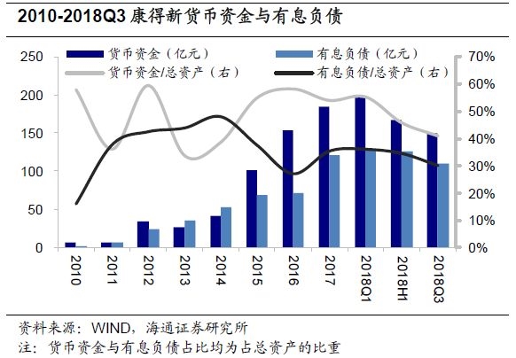 2015年之后货币资金占总资产比重连续处于40%以上。坐拥高额货币资金,却依然违约,以及货币资金与有息负债双高的局面,是康得新备受市场质疑之处。具体来看,2015、2016年康得新货币资金大幅增长,从2014年的41.93亿元增长至2016年的153.89亿元,2018年一季度达到峰值197.28亿元,之后有所回落,三季度最新数据为150.14亿元。货币资金占总资产的比重在2015年之后一直处于40%以上水平。