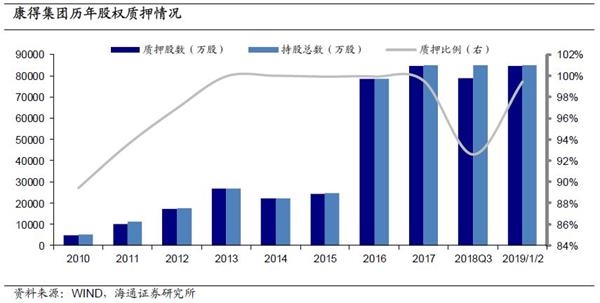 迹象一:高股权质押比例。根据历年年报、18年三季报披露的数据,以及2019年1月2日控股股东质押公告,以质押股数和持股总数之比计算质押比例,可以看到康得集团质押比例常年处于高位,2013-2017年连续处于99%以上水平,几乎质押全部所持有的康得票。2018Q3质押比例下降至92.59%,2019年1月2日又回复到99.45%的高位。