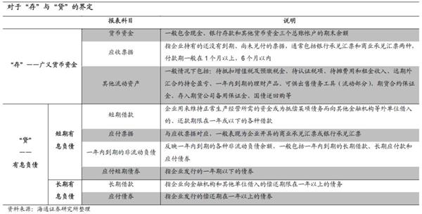 存贷双高中“存”的定义。存贷双高指公司账面显示的货币资金与有息负债同时处于较高水平。“货币资金”科目中的非受限部分一般是公司可以自由动用的资金,除此之外,许多公司购买的产品计入“其他流动资产”科目,“应收票据”一般包括商业承兑汇票和银行承兑汇票,变现能力也较强。因此我们定义这里的“存”为广义货币资金,数额等于货币资金、应收票据和其他流动资产三个科目的总和。下文提到的货币资金均指广义货币资金。