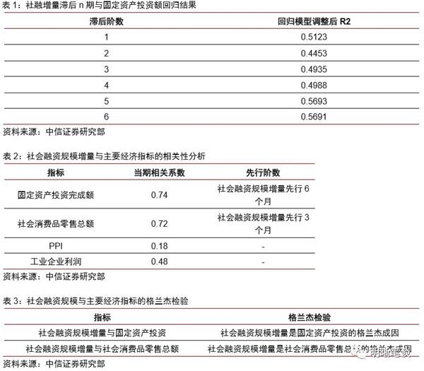 社会融资规模增量与部分经济指标相互关系紧密。由于社会融资规模是从实体企业的负债端考量金融对实体的支持力度,在囊括了间接融资的同时剔除未流向实体企业的货币投放,可以更为准确地观察实体企业的融资情况,所以社会融资规模和经济基本面有着相关关系。通过实证分析,社会融资规模增量与社零总额和的相关性明显,而另一方面社会融资规模增量与工业企业利润和的相关性则表现较弱。