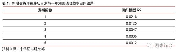 社融增量同比对十年期国债收益率的直接解释力度不高。我们选取了2003年2月-2018年1月的社会融资规模余额同比增速和十年期国债收益率序列进行回归研究,回归结果显示模型的R2较低,滞后二期、三期、四期、五期后的R2仍无改善,因此我们认为同比对十年期国债收益率的直接解释力度不高。