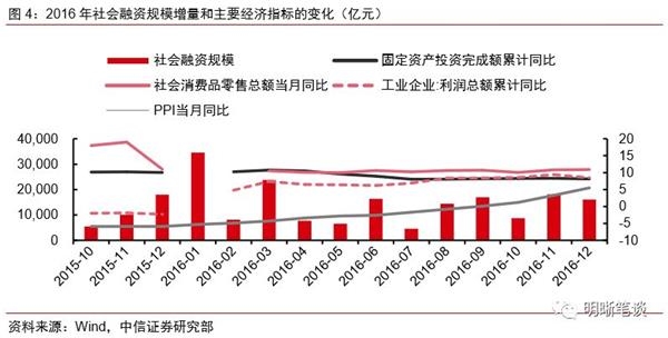 2016年1月份社融增量出现大幅度反弹,但在资金空转的影响下实体经济并未发生明显反弹。2016年1月社融增量为3.42万亿,分别比上月和去年同期多1.61万亿和1.37万亿,比较突出的变化主要表现在企业部门和居民部门的中长期贷款,占整个社融新增的74.3%。但是固定资产投资完成额的增长在接下来的时期并没有达到预期,这是因为虽然虽然流向企业部门的信贷增加,但是这部分资金并没有流向实体领域而是在经济体系空转,在央行的《2016年第四季度中国货币政策执行报告》中也明确指出此问题,要抑制资产泡沫,防止“脱实向虚”,由此引发了2017年的金融去杠杆。消费方面,2016年全年来看,社会消费品零售总额虽突破33万亿元,同比增长10.4%,但相较于2015年的同比增速14.68%少增4.28%。虽投资与消费领域未出现明显向好趋势,但是企业利润和PPI有所改善。2016年规模以上工业企业利润实现增长,扭转了2015年利润下降的局面。PPI同比增速在该年的9月份由负转正,结束自2012年2月份以来的负增长周期。整体来看,虽部分指标有所改善,但实体经济下行压力犹存。