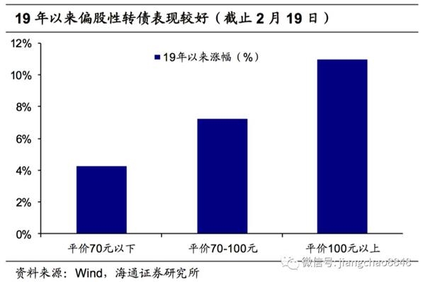 如果从转债性质来看,则是偏股性券近期的表现更佳。我们按照平价70元以下(偏债性)、平价70-100元(混合性)、平价100元以上(偏股性)来对转债个券进行划分,截止2月19日,偏股性、混合性、偏债性三类转债19年以来涨幅分别为11%、7.25%和4.23%,股性越强的个券表现越好。