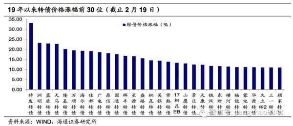 个券方面,截止2月19日,131只转债19年以来基本全面上涨,其中涨幅较高的是特发转债(33.05%)、洲明转债(23.25%)、蓝盾转债(22.91%)、天马转债(22.69%)和隆基转债(20.14%)。因此从行业来看,偏成长的通信、电子、光伏等行业表现较好。