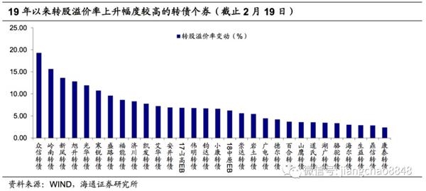 但本轮转债的反弹不只是股市上涨的推动。在转债的反弹过程中(1月21-31日)曾一度伴随着估值的回升,这在历次转债的上涨中是比较少见的,表明转债市场本身也走出了一定的独立行情。那么哪些转债在拉估值?我们统计了19年以来转债个券和对应正股的涨跌幅,131只转债个券中,有42只转债涨幅超过正股,导致溢价率明显上升。其中溢价率上升幅度最高的是众信转债(+19.3%)、岭南转债(+15.7%)、新凤转债(+13.6%)等。总结下来主要是两类: