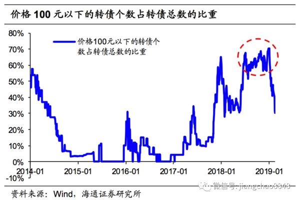 此外,从绝对价格来看,截止18年底转债市场平均价格100.6元,处于历史10%分位数水平。其中价格在100元以下的转债有83只,占全部转债数量的63%,这一比例处于14年以来的最高点。而价格在95元以下的转债也有42只,占全部转债数量的32%。大量的低价券价格已经贴近债底,下跌空间有限,较高的性价比也吸引了投资者的关注。