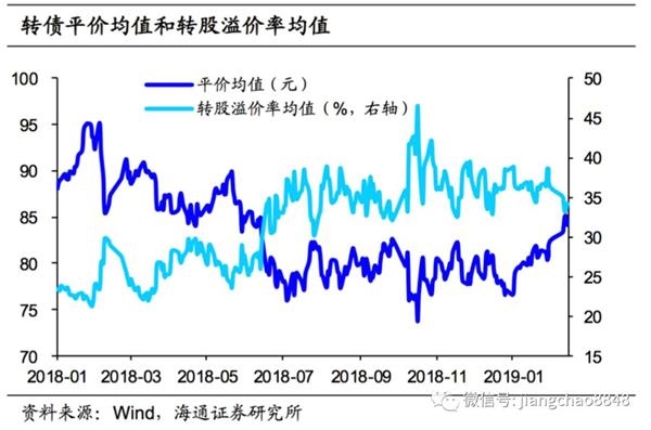 1)经历一年的下跌后,转债处于相对低位。截止18年底,转债市场的溢价率均值为38%,高于历史均值(31.2%左右)。但新券和老券之间的估值有明显分化,老券经历了18年的大跌,估值明显上升。而新券由于18年集中发行,加上市场情绪不佳,估值普遍处于低位。根据我们的统计,18年下半年以来上市的新券,转股溢价率均值仅为15.7%左右;18年四季度以来上市的新券,转股溢价率更是仅有12%左右。这部分新券在本轮转债的上涨中,出现了转股溢价率的上升。