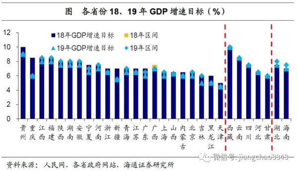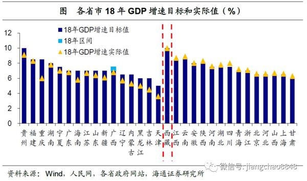 值得注意的是,重庆、吉林、天津、内蒙古、海南和黑龙江等六省18年GDP增速均低于目标增速1个百分点以上,这导致重庆和黑龙江19年GDP目标大幅下调。