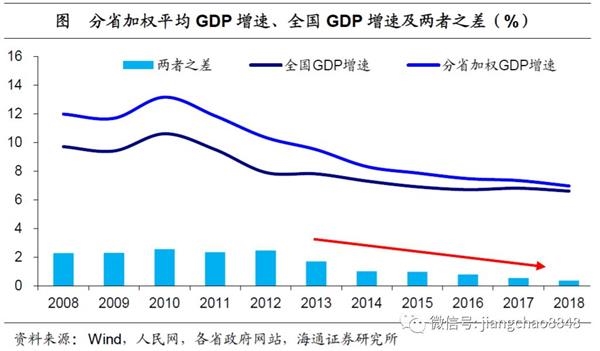 二是数据水分不断挤出。伴随着我国经济发展阶段的转变,GDP增速目标的考核逐渐淡化,经济增长更重质量,13年以来,地方政府主动挤出过去经济数据中存在的水分,甩开增长包袱。比如辽宁、内蒙古、天津等省份就曾主动核减经济数据。而各省加权平均GDP增速与全国GDP增速之差也从08-12年的2.4%左右,持续下降至18年的0.4%。地方经济数据水分的不断挤出,也使得其增速目标的下调成为了必然。
