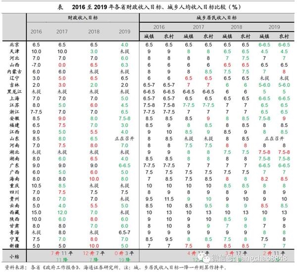 居民收入目标缓中趋降。由于农村和城镇居民收入先后在17、18年提前完成十八大“翻一番”目标,地方政府居民收入目标的约束有所放松,从17、18年的持平为主、部分下调,转为下调为主。这较为真实地反映了地方政府对于经济、就业压力的担忧。而居民收入增长继续放缓,前期举债购房透支消费,也令地方政府对消费前景较为谨慎,18个公布了增速目标的省份中,7个持平,9个下调。