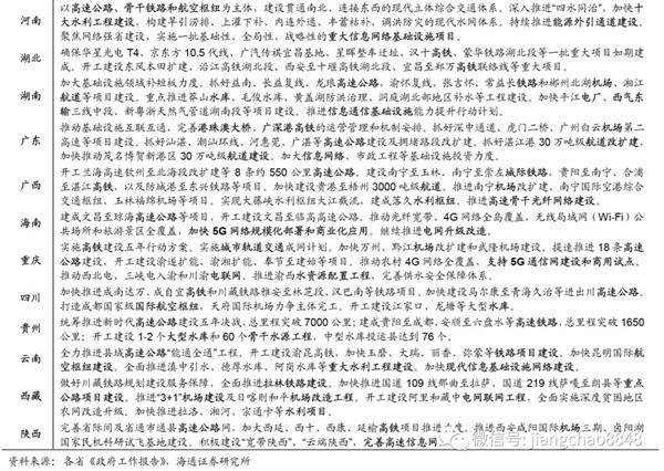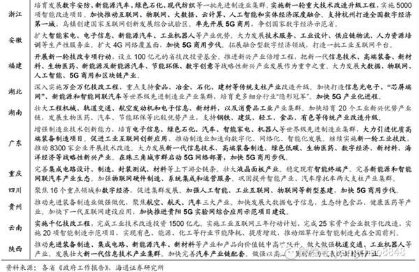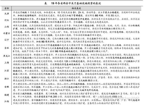 中西部铁公机,东部轨道交通,建设5G网络。地方政府在其两会公报中贯彻中央精神,普遍提出要“扩大有效投资”、“实施补短板重点项目”。具体来看,中西部省份基建项目以铁路、高速公路、机场、水库、航道等传统基建为主,而东部发达省份基建项目则以轨道交通、地下管廊为主。作为新经济的典型代表,业也受到地方政府的普遍重视,各省纷纷提出,要加强信息基础设施建设、加快5G商用步伐。