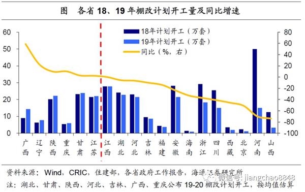 下调棚改目标,降货币化比例。目前已有19个省份公布了19年的棚改目标,计划总开工260万套,较18年下降20%。其中,河南、浙江、安徽、四川等棚改大省计划开工量均大幅下调,河南降幅高达70%,而仅有6省微幅上调。住建部曾在去年10月底座谈会上称,要进一步降低棚改货币化安置比例,未来棚改融资以棚改专项债为主。棚改规模、货币化比例双双下调,意味着19年地产销售、投资都将承受较大下行压力。