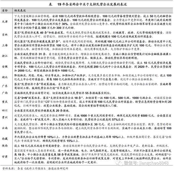 地方出台政策呵护民企发展。在中央定调支持民企发展壮大的背景下,地方政府也纷纷出台政策呵护民企发展,力度远强于往年。从各省19年两会公报看,在落实中央6方面措施的同时,还有以下三大亮点:一是出台省级政策措施,比如吉林、上海、浙江、广东、广西、重庆、四川、甘肃等省均已出台条例,旨在系统支持民营经济健康发展。二是提出融资支持目标,比如天津、吉林、上海、安徽、湖北、重庆均提出要设立100亿元的民企纾困;其中部分省份还制定了民企发展基金、再贷款和再贴现资金、融资担保发展基金的目标规模。三是打破部分领域民企进入壁垒,比如吉林提出打破教育、旅游、文化领域壁垒;重庆提出放宽公共服务、基础设施、国企改制等领域准入门槛;甘肃提出进一步放开机场、电力、油气勘探开发、交通等领域准入。