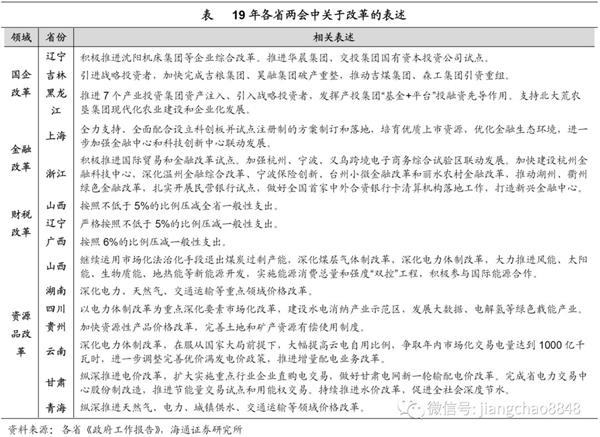 “深化改革”同样成为19年地方政府的重点工作,海南省明确指出,19年是“海南全面深化改革开放的关键之年”。从具体内容看,各省改革内容主要涵盖以下几个方面: