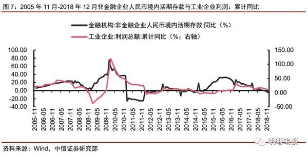 企业利润下降和非标融资融资受限是导致企业活期存款下降的重要因素。企业盈利能力下降企业现金流下降,也将导致企业活期存款下降,进而影响M1增速。工业企业利润增速与企业活期存款具有较强的关联性,2018年以来工业企业利润不断下行,与企业活期存款走势一致。2015至2016年期间,非标飞速发展,同期M1增速也一路高增,2017年后随着监管趋严,表外融资受限,企业活期存款下降,2018年随着监管文件集中落地,非标业务收缩,企业活期存款进一步下降。