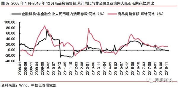 企业存款与房地产走势密切相关,居民定期存款向企业活期存款转化转弱,是企业活期存款同比增速下降的原因之一。回顾2007年2月至2018年12月的历史数据,我们可以发现,商品房销售额增速与非金融企业境内人民币存款同比增长有较为明显的相关性。在地产销售火热时期,购房行为导致居民的中长期存款转化为企业的活期存款,使得M1大幅增长。今年以来受房市调控影响房地产走弱,居民定期存款向企业活期存款的转化减弱,企业活期存款增量减小。
