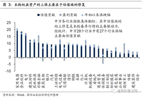 年初以来A股主要股指纷纷大幅上涨,其中估值端的向上修复是本轮春季行情的主要驱动力。具体来看,年初以来,A股主要股指纷纷大幅上涨,申万各行业指数同样集体翻红。从各行业涨跌幅的贡献因素来看,申万28个行业中仅国防军工行业涨幅以盈利贡献为主,其余27个行业涨幅均由估值修复驱动,其中家用电器、食品饮料、电子三个行业估值涨幅居前,年初至今估值分别上涨19.2%、18.6%和17.2%。