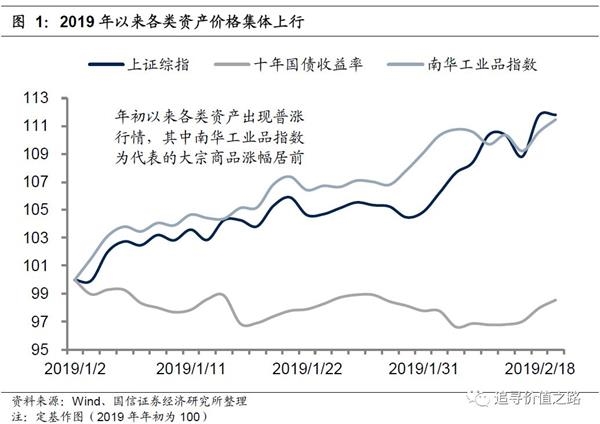 在经济下行存压的普遍共识中,本轮大类资产的共振回暖大超市场预期。2017年底开始的去杠杆使得企业信用利差大幅飙升,实体经济面临流动性危机,此后虽然政策有所转向,但社融等一系列金融指标显示“宽”到“宽信用”的传导并不畅通,经济下行压力依然较大。因此2018年底,市场大多投资者认为在看到金融、经济数据改善之前(预计经济在今年二季度左右企稳),大盘指数或将维持横盘震荡走势,而在经济下行、需求疲弱的环境中,对大宗商品的预期更是极度悲观。所以,年初以来本轮大类资产的共振回暖大超市场预期。