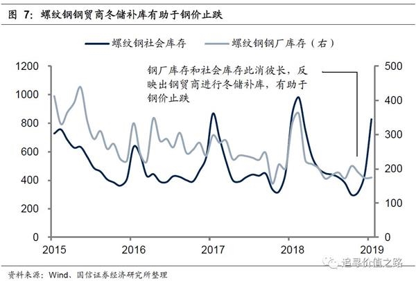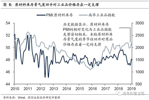 第一,季节性补库存短期对商品价格存在一定支撑。2019年1月原材料库存为48.1,环比上升1.0,历史数据显示,原材料库存PMI的相对变化与工业品指数走势密切相关,本轮原材料库存景气度的季节性回升(每年春节前后原材料库存景气度呈季节性上升)对商品价格存在着一定的支撑。以螺纹钢为例,2018年底螺纹钢钢厂库存和社会库存此消彼长,反映出钢铁贸易商进入冬储补库,在需求疲弱的外部环境中,钢贸商的冬储行为有助于商品价格的止跌。