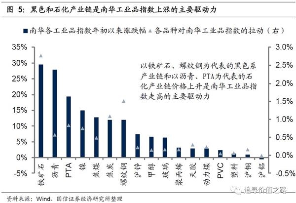 铁矿石、螺纹钢为代表的黑色系产业链和以沥青、PTA为代表的石化产业链强势支撑南华工业指数走高。具体来看,南华工业品指数所包含的17种大宗商品仅铝小幅下跌,其余工业品价格纷纷上涨。其中南华铁矿石指数、南华沥青指数、南华PTA指数涨幅居前,年初至今分别上涨29.5%、27.9%和19.4%。综合考虑各商品涨跌幅及其在南华工业品指数中所占权重后,可以发现铁矿石、螺纹钢为代表的黑色系产业链和以PTA、沥青为代表的石化产业链强势拉动南华工业指数走高。