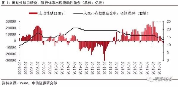 降准操作对流动性缺口的补充效果非常明显,流动性缺口转负,流动性实现超额供给。受春节等季节性因素对流动性需求和供给的影响,2018年1月份流动性缺口季节性扩张至3.5万元左右,为近年来最高峰;2017年末、2018年初银行体系流动性缺口均超2万亿元,接近历史最高水平。但随着2018年二季度起降准政策的连续实施,银行体系流动性缺口快速收窄,7月降准后流动性缺口小幅转负;2018年10月降准后,流动性缺口已经连续两个月为负,银行体系出现流动性盈余,说明2018年流动性实现了超额供给。