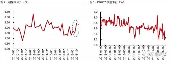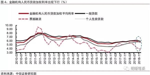 从货币政策效果来看,超储率上升、利率下行。2018年下半年以来,DR007紧贴7天逆回购利率2.55%低位运行,并时有突破。与此相对应的是,银行超储率也有所提高,2018年底已经升至2.4%,一方面存在显著的季节因素,另一方面也反映银行间流动性十分充裕。而实际上,正如央行在货币政策执行报告中所说,“宏观政策的效果正在显现”。在长期的宽松流动性化,资金利率下行正逐渐传导至信贷市场,2018年四季度人民币加权平均贷款利率较9月末降31bps;从结构来看,一般贷款和票据融资加权平均利率下降28bps和38bps,个人住房贷款加权利率虽然上行3bps,但实际上已经从2018年11月高点有所下滑。
