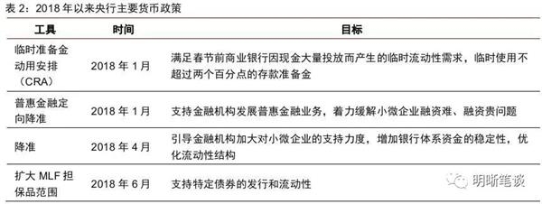 四季度报告更加强调通过结构性货币政策刺激银行信贷,进而改善小微、民营企业的融资问题。报告强调货币政策的传导取决于资金供、求双方的意愿和能力,关键是引导银行的行为,表达了央行将以银行信用扩张作为中枢,继续创新和运用结构性货币政策工具的政策思路。纵观全年,央行出台的货币政策中结构性政策居多,主要包括定向降准、扩大合格担保品范围、创设TMLF工具、创设央行票据互换工具等。我们对2018年主要工具梳理如下表所示: