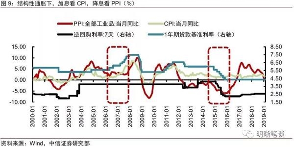 在经济的结构性矛盾性,通胀体现出结构性问题,降息看PPI。2016年以来通胀的结构性特征愈发明显,PPI与CPI长期背离。2016~2017你那,供给侧结构性改革,上游供给收缩带来涨价与下游需求弱,PPI上行而CPI平稳;展望2019,上游需求不足预计PPI下行,下游猪价上涨预计拉动CPI上行。而从历史上看,加息看CPI,降息看PPI。因而若PPI长期转负,降息的可能仍然存在。