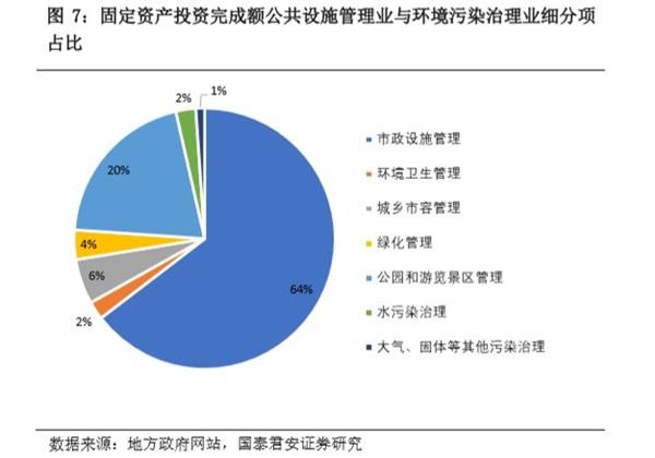 们针对基建中占比10%的公共设施管理以及环境污染治理的投资完成额细项进行统计,发现公共设施管理行业中市政设施管理以及公园和游览景区管理占据主体,环境污染治理业中水污染治理以及大气和其他污染治理投资较高(图7)。因此,融资平台在准公益性的制约下,项目收益低也对偿债带来了影响。