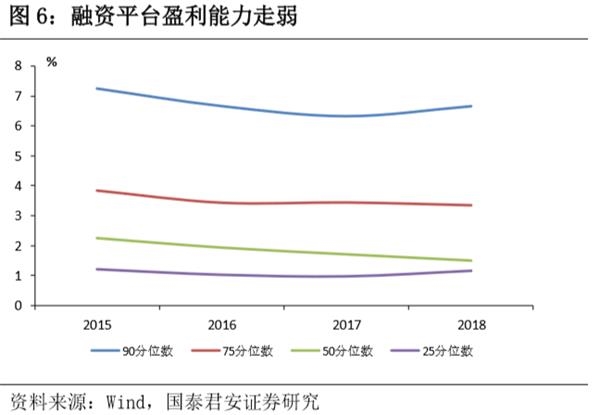 大量的融资平台承担了公益性以及准公益性的项目,项目特质决定了平台整体盈利能力较为有限(图5)。根据wind统计的地方融资平台数据,我们汇总了含有所属行业分级信息的1323家平台,整体来看,样本中融资平台绝大多数集中于建筑与工程行业。结合盈利能力变化情况来看,在大量的准公益性项目覆盖下,融资平台的盈利能力逐年走弱。2015-2017的731家连贯样本来看,ROE中位数分别为2.24,1.92,1.70。结合2017、2018年中报的549家增速预判,2018年ROE中位数将达到1.49,整体呈现出逐年下降的趋势(图6)。