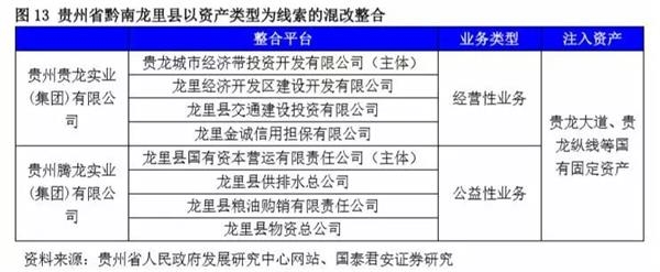 湖北省武穴市文件提到的融资平台转型基本可以划分为此类:“按照‘依托城市资源、盘活存量资产、借助资本市场、创新融资模式、精干高效运营’的要求,组建市城发集团。做实做大做强‘土地整理开发、城市基础设施投资与运营、城市资产经营管理、地产置业和资本经营’五大业务”。浙江省新昌市的文件中也提及类似转型方案:“通过对县内24家平台公司转型,建立县投资发展集团公司一个核心集团,整合组建城投集团、交通投资集团、旅游集团、高新园区投资集团、工业园区投资集团等五大集团”,该方案也与贵州省龙里县早年的平台转型方式异曲同工。