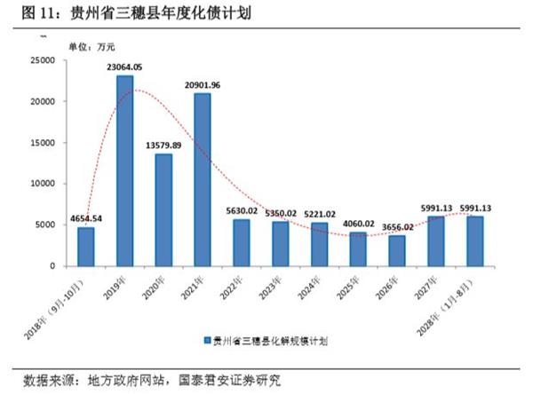 (1)债务化解期限:用5到10年的时间全面化解存量隐性债务(以中央最终确定的时间为准,存在少部分县市时间跨度较短3到5年),使政府综合债务率逐步降至合理水平。从部分县域的计划来看,主要化债压力集中于近三年(图11)。