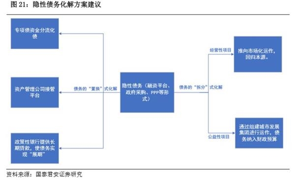 综合来看,我们认为对于隐性债务的化解,在各省份整体债务负担率较高的状态下,地方财政独木难支,未来需要多方助力,新一轮“自上而下”地对隐性债务处置已经不远。在未来化解过程不仅需要新一轮的债务置换,将过往高债置换为低债,同时专项债资金参与化债,政策性银行利用长期贷款进行债务展期,以及资产管理公司接管部分平台均具有一定的必要性(图21)。当然,在这个过程中要防范道德风险,因此,必须彻底调整融资平台运营模式,在融资平台转型过程中与国有企业改革有效结合,进一步推广湖北省武穴市、浙江省新昌市以及贵州省龙里县的案例,剥离公益性项目将平台充足成立城市发展集团,为后续债务的显性化以及公益项目低息债务的获得提供有利条件。