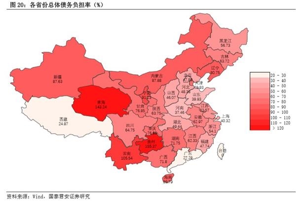 除市场化转型方式外,地方财力对于30万亿以上的隐性债务化解独木难支。若2019年全年化债比例达到15%,总体规模也将达到5万亿左右(未包含存量带息债务利息),在减税降费加码、土地出让收入大幅回落之中,地方财政资金掣肘明显。结合当前区域债务的统计来看,贵州、青海、云南、天津、新疆等地区显性债务负担率较高。叠加隐性债务因素后,整体债务风险方面,贵州、青海、云南、宁夏、海南等地区风险较高(图20)。上述省份以及部分省份中的个别县市债务负担极大,经济下行进程中,风险将逐渐暴露。