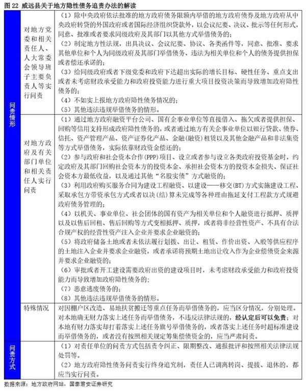 在整理大量地方文件后,我们发现四川省内江市威远县对于中央46号文的解读基本透露出隐性债务追责的具体信息,我们的汇总整理结果参见图22。