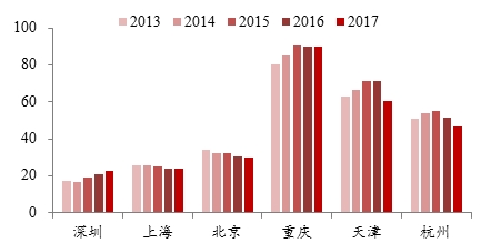 此外,还可以从固定资产投资占GDP的比重来衡量产出效率,这也可以体现投资质量。通过比较2013~2017年国内几大中心城市的固定资产占GDP比重发现,排序为深圳、上海、北京、杭州、天津和重庆,即深圳和上海的产出效益分别为第一、第二,重庆最差,天津次之。产出效益差的城市,未来经济增速一定会大幅下滑,因为高投资不可持续。
