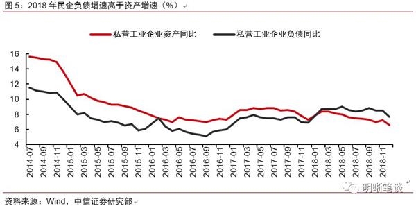 自2018年2月份以来,民企的资产增速与负债增速呈现双双下滑趋势,但是负债增速高于资产增速,资产负债率依旧攀升。民营企业的资产负债率从2017年末的51.6%上升至2018年末的56.4%,上升4.5个的百分点,而2016年末的资产负债率相比2017年末仅增加0.9个百分点。
