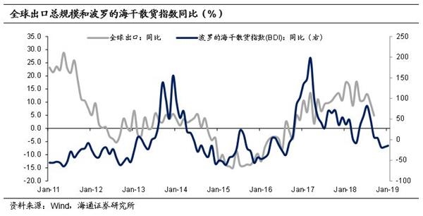 全球贸易回落趋势明显。作为全球最重要的两大经济体,美国和中国的制造业PMI去年底均明显下行,反映两国经济面临下行风险,对全球需求或形成拖累,且两国贸易摩擦持续升温的负面冲击也逐渐体现。18年9月全球出口总规模同比增速下降至4.9%,远低于上半年14%左右的平均增速,19年1月对全球贸易有着较高相关度的波罗的海干散货指数(BDI)同比降至-14%,意味着全球需求和贸易增速存在继续放缓的风险。