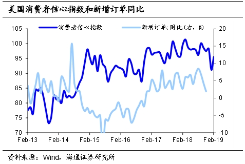 首先,作为全球经济的火车头,美国经济出现走弱迹象。18年美联储加息4次导致联邦基准利率累计上升100BP,偏紧的货币政策对经济产生下行压力,12月美国制造业PMI指数下降5个百分点至54.3%,尽管1月有所回升,但是也低于去年平均水平。美国已经从前期的高点回落至2月的95.5,累计下降约5个百分点,而制造业新订单同比也从2018年8月的8.4%下降至11月的1.9%。