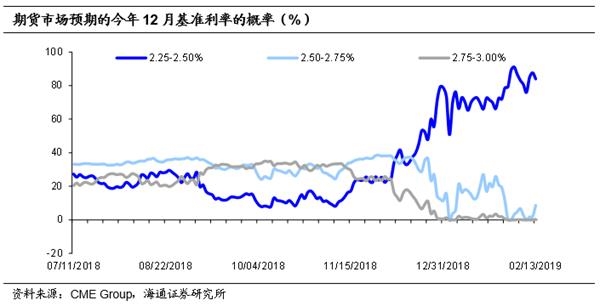 去年末美联储态度由“鹰派”转“鸽派”。面对强劲的经济表现和持续上涨的通胀,2018年美联储货币政策不断收紧,全年加息4次,收缩资产负债表规模3700多亿美元。但是,自去年11月底美联储主席鲍威尔表示基准利率已经接近中性利率之后,美联储开始不断释放鸽派信号。1月议息会议,美联储下调了经济预期,同时鲍威尔表示正在评估结束缩表的时间点。无论是经济预期判断变化还是缩表计划评估,均反映了美联储对于货币政策态度的转变。对此,市场普遍预期今年美联储不加息的概率已经超过80%。