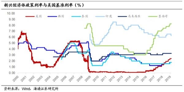 过去几轮美联储历次加息/降息周期,新兴经济体的货币政策大多呈现跟随的表现。00年互联网泡沫破灭,美国经济陷入衰退,叠加01年“9·11”冲击,美联储降息刺激经济。00至03年间,美联储将目标利率由6.5%下调至1%,同一时期,韩国的基准利率也下调了125bp。到04年,为应对不断走高的通胀和抑制资产价格泡沫,美联储两年间连续17次加息,将基准利率提高到5.25%,同期韩国、泰国、马来西亚等多国央行也跟随上调基准利率。而08年危机爆发、全球经济遭遇冲击,各新兴经济体也都跟随美联储大幅降息。