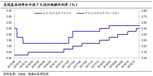一是公开市场不再跟随美联储加息。本轮加息周期,美联储分别在15和16年各加息1次,而在17和18年分别加息3次和4次,随着加息频率提高,中国央行分别在17年2月和3月跟随上调公开市场逆回购利率10BP,但到17年12月和18年3月,仅分别加息5BP,而此后美国三次加息,公开市场利率未再跟随上调。