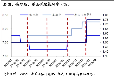 新兴市场牵制减少。美欧等发达经济体货币政策主要是自身基本面驱动,而新兴市场则不少是跟随美联储政策调整。一方面美欧等发达经济的状况决定了新兴市场外需的好坏,最终影响经济和通胀,另一方面,新兴市场也不得不在货币政策独立性、固定汇率和资本自由流动的三元悖论中做出取舍。过去几轮美联储历次加息/降息周期,新兴经济体的货币政策大多呈现跟随的表现。本轮美国加息周期已近尾声,对新兴经济体货币政策的制约也在减少。去年12月俄罗斯、墨西哥和泰国,都在美联储加息之际上调了政策。从通胀看,18年10月以来泰国和墨西哥的通胀其实稳中有降,而俄罗斯同比虽然回升,但绝对水平不算高,因而这些国家当时加息也是在跟随美联储的货币政策。1月美联储放出加息暂缓的信号,2月墨西哥、泰国、俄罗斯三国央行均表示保持政策利率不变。