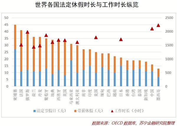 以上劳动参与率只是宏观上的数据,法定假日和工作时长更能反映职场上的国人勤劳程度。