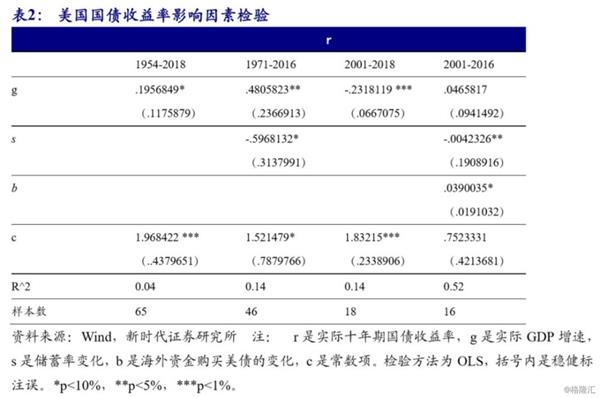 因此,我们可以看出,美国长期国债收益率一直走低,至少有以上三方面因素。第一,美国经济增速不断下滑。第二,次贷危机之后,美国整体储蓄率有所上升(见表2回归结果)。第三,2000年之后,海外资金对美债需求大幅增加。这背后的原因可能是,一方面,全球化环境下,中国等高储蓄国家对美贸易顺差扩大,然后再购买美债,这相当于其他国家将储蓄转移到美国;另一方面,缺乏大的科技进步引致全球经济增速不断下滑,全球安全资产需求增加。