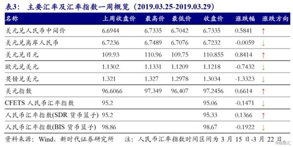 近期美元指数回升,人民币汇率贬值。截至3月29日,美元兑人民币即期汇率收至6.7202,一周上行142BP;美元兑人民币汇率中间价收至6.7335,较前一周上行391BP;美元兑离岸人民币汇率收至6.7232,较前一周下行4BP;12个月期美元兑人民币NDF收至6.7800,较前一周下行280BP。